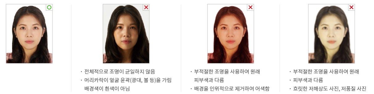 - 머리 스타일: 얼굴이 완전히 드러나야 하며, 머리카락이 눈이나 얼굴을 가리지 않아야 합니다.