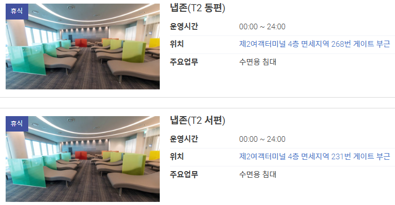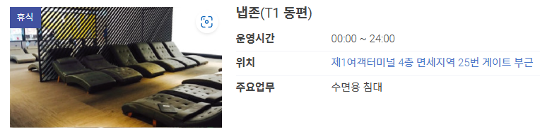 ▶ 무료 수면실 (터미널 1, 탑승동 4층 및 터미널 2, 탑승동 3층): 여행 중 잠시 눈을 붙일 수 있는 안락한 공간으로, 어두운 조명과 조용한 분위기 속에서 편안하게 휴식을 취할 수 있습니다.