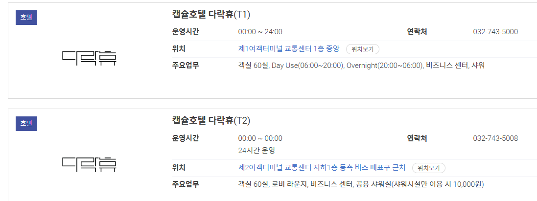 ▶ 캡슐 호텔 (터미널 2, 지하 1층): 짧은 시간 동안 숙면을 취할 수 있는 공간 (유료 서비스)