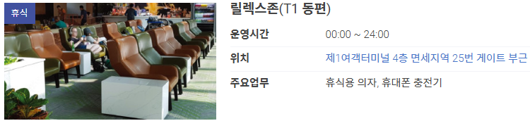 ▶ 릴랙스 존 (터미널 1, 탑승동 4층): 무료 안마의자와 편안한 소파가 있는 휴식 공간